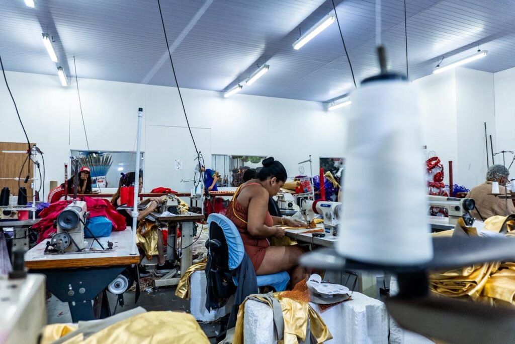 “Era complicado conseguir trabalhar aqui, no auge do verão. Dependendo do horário, não tinha ventilador que desse vazão. À medida que ela iam avançando com o trabalho tinha a quentura das máquinas e a pilha de fantasias ia subindo ao lado delas. Chegava fácil a mais de 50º de sensação térmica”, conta Alessandra Reis, responsável pelos ateliês de fantasias da Viradouro.
